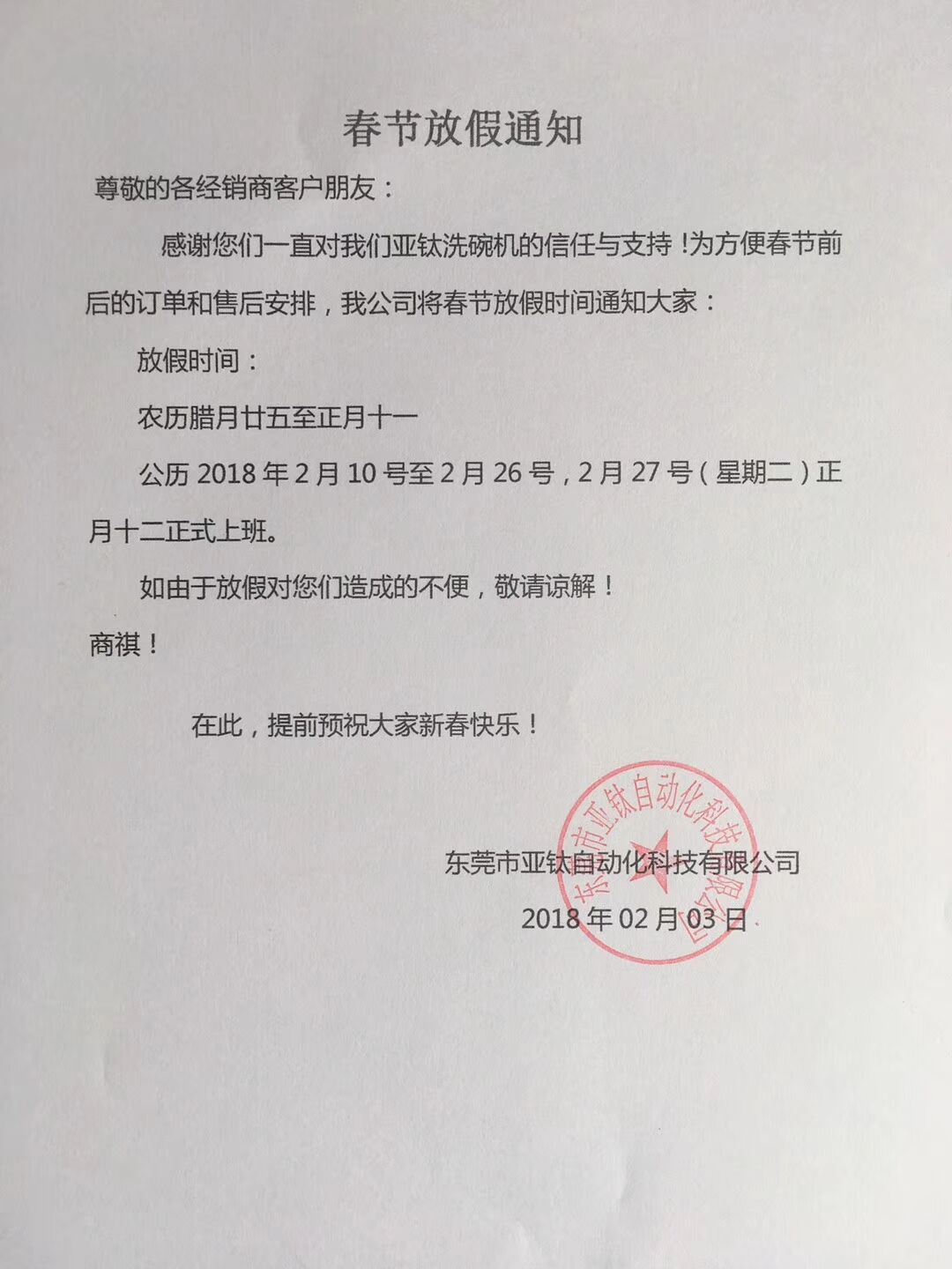 亞鈦春節(jié)放假通知