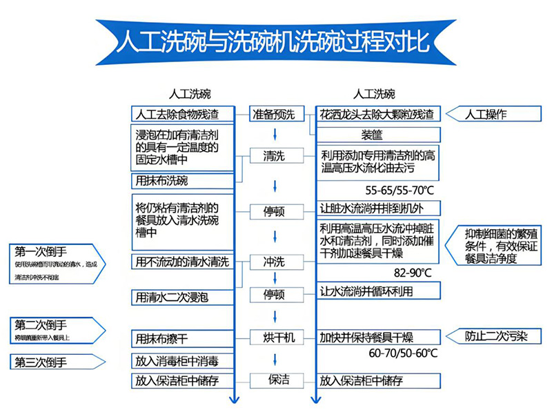 綜上所述,洗碗機不僅能更高效地按時完成洗滌任務,而且更干凈衛生,既節省了人力成本,又更加安全可靠。它能迅速清除餐具上的油脂,且無任何殘留,確保餐具使用安全,避免細菌交叉感染,更符合國家餐飲行業的衛生安全標準。